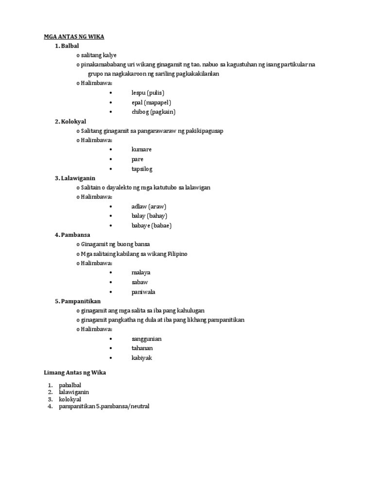 Apat na halimbawa ng wika. Pabalbal Balbal May katumbas itong slang sa Ingles at itinuturing na pinakamababang antas ng wika. 162021 Simile o Pagtutulad Pinakamadaling uri ito dahil kagyat na nakikilala sa mga salita o pariralang ginagamit tulad ng parang wangis animoy gaya ng tila mistula atb. Pangunahing wika ng Silangang Visayas partikular sa buong pulo ng Samar hilagang-silangang Leyte at ilang bahagi ng Biliran.